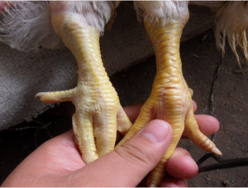 1.肉雞生長緩慢,采食慢,腿爪顏色發(fā)淺、發(fā)白,色素沉積不良。后期采食慢,不漲料,料肉比急劇增高;