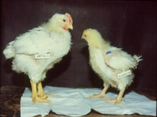 患病雞羽毛粗亂,相對正常雞個(gè)體明顯偏小,雞爪蒼白(左側(cè)為對照