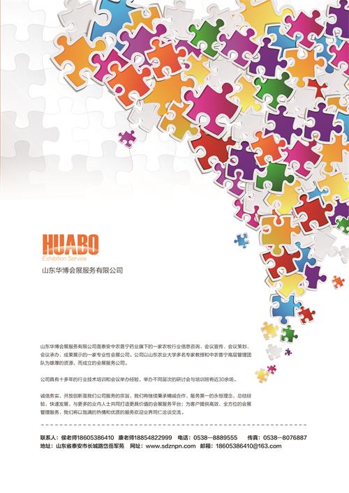 山東華博會(huì)展服務(wù)有限公司是泰安中農(nóng)普寧藥業(yè)旗下的一家農(nóng)牧行業(yè)信息咨詢、會(huì)議宣傳、會(huì)議策劃、會(huì)議承辦、成果展示的一家專業(yè)性會(huì)展公司。公司以山東農(nóng)業(yè)大學(xué)多名專家教授和中農(nóng)普寧高層管理團(tuán)隊(duì)為雄厚的資源,而成立的會(huì)展服務(wù)公司。