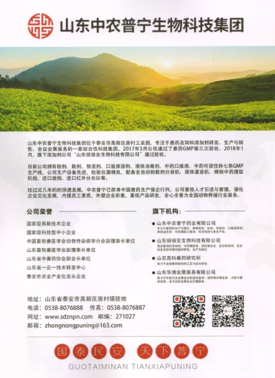 為此,作為致力于動物健康與人類食品安全為發(fā)展宗旨的中農(nóng)普寧生物科技集團(tuán),通過中獸醫(yī)專家的潛心研發(fā)經(jīng)過多年臨床實踐,結(jié)合國內(nèi)蛋禽養(yǎng)殖特點(diǎn),隆重推出了倍新美、安爾康、安若素等中藥產(chǎn)品,為養(yǎng)殖業(yè)保駕護(hù)航。