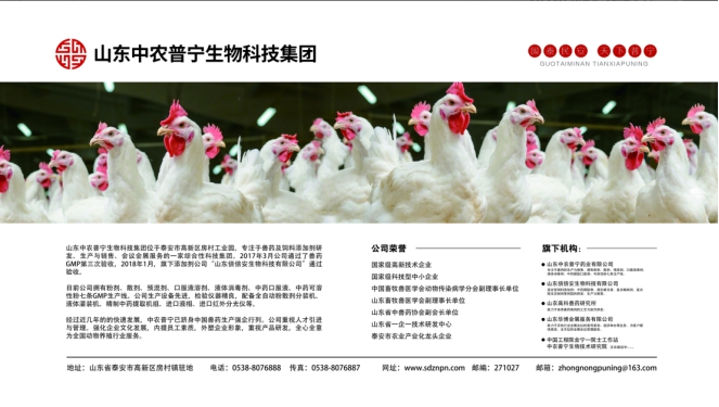 隨著政府對動物源性食品安全問題的極大關(guān)注以及民眾對食品安全重要性認(rèn)識的不斷提高,中獸醫(yī)藥必將在畜禽綠色健康養(yǎng)殖中發(fā)揮出更大的作用,為此,作為以致力于動物健康與食品安全為發(fā)展宗旨的中農(nóng)普寧生物科技集團(tuán),通過中獸醫(yī)專家的潛心研發(fā)經(jīng)過多年臨床實踐,結(jié)合國內(nèi)肉雞養(yǎng)殖特點,隆重推出了安爾康、安若素、倍爾爽等中藥產(chǎn)品,為養(yǎng)殖業(yè)保駕護(hù)航。