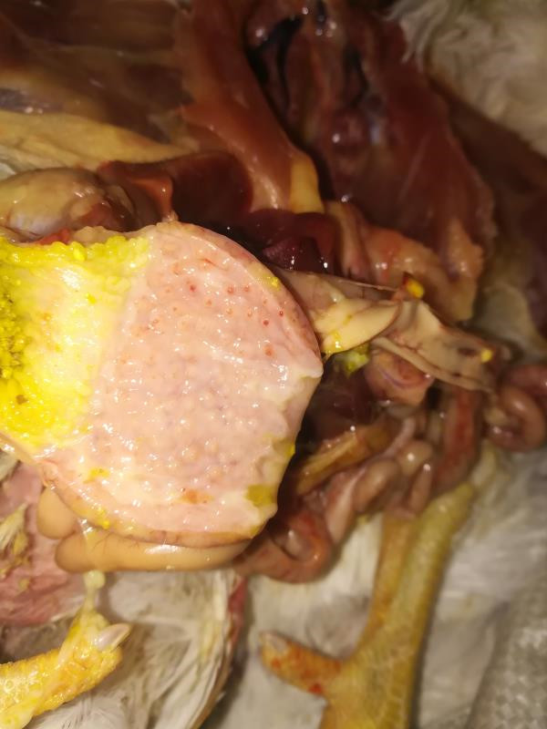 1.病原為霉菌和大腸桿菌時(shí)表現(xiàn)為:呼吸困難、消瘦、精神沉郁、排黃綠色稀便,感染嚴(yán)重的雞群死亡率很高,尤其是雛雞發(fā)病較多。剖檢可見腸道水腫,腸內(nèi)膜呈麩皮樣,氣囊、肺有霉斑。