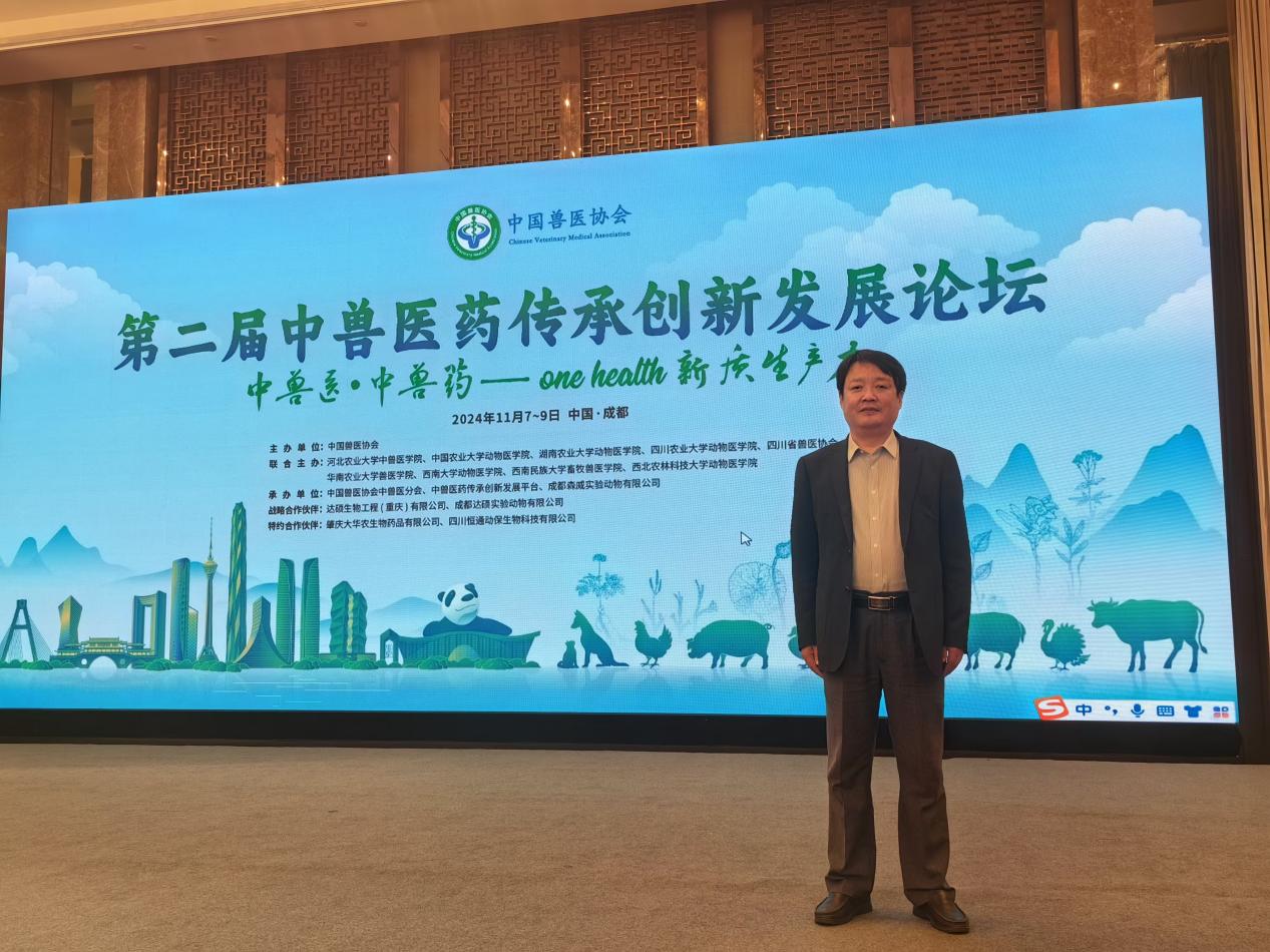 2024年11月8日,中國獸醫(yī)協(xié)會(huì)第二屆中獸醫(yī)藥傳承創(chuàng)新發(fā)展論壇在成都開幕,本次論壇吸引了來自行業(yè)主管部門、全國疫控系統(tǒng)、科研院校、動(dòng)物診療機(jī)構(gòu)、藥品企業(yè)、動(dòng)保企業(yè)、行業(yè)協(xié)會(huì)及行業(yè)媒體等800余人參加,公司技術(shù)總監(jiān)王金紀(jì)代表中農(nóng)普寧參加了本次論壇。