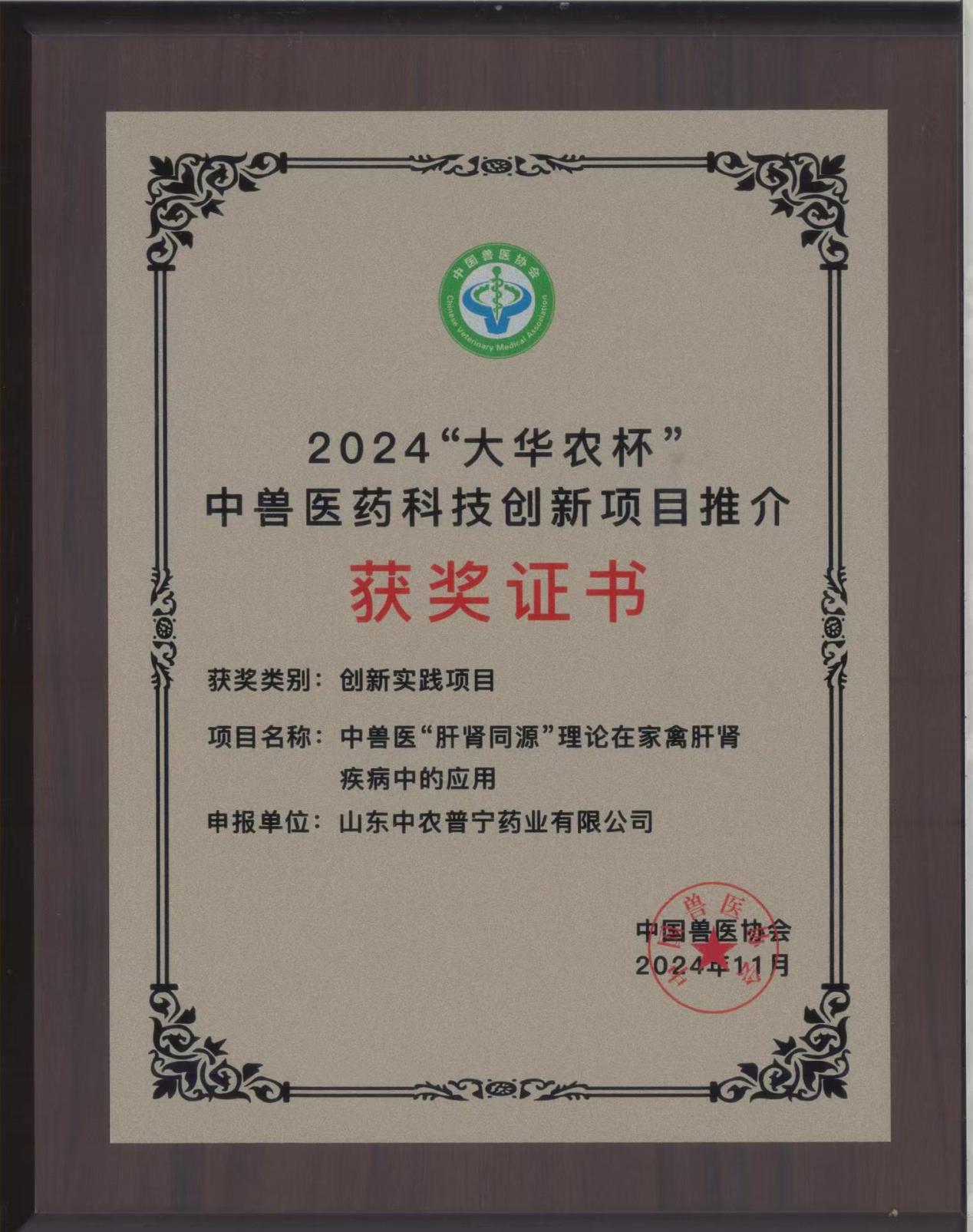 論壇以“中獸醫(yī)·中獸藥—one health新質(zhì)生產(chǎn)力”為主題,圍繞中獸醫(yī)藥的傳承創(chuàng)新、人才培養(yǎng)和平臺(tái)共建三大核心議題進(jìn)行。在本次論壇中,公司技術(shù)總監(jiān)王金紀(jì)的《中獸醫(yī)“肝腎同源”理論在家禽肝腎疾病中的應(yīng)用》(暨甘甚寶研發(fā)理念和思路),榮獲中國獸醫(yī)協(xié)會(huì)2024年“大華農(nóng)杯”中獸醫(yī)藥科技創(chuàng)新項(xiàng)目獎(jiǎng)。